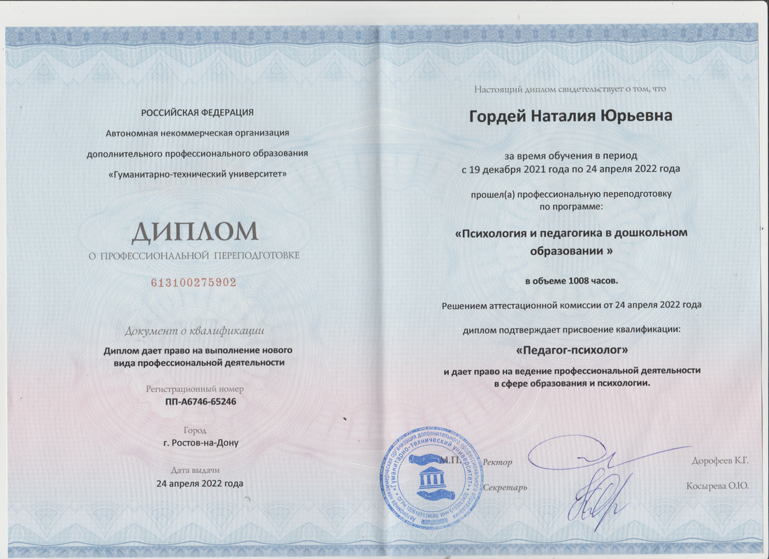 прошла профессиональную переподготовку в 2022 г. в Автономной некоммерческой организации дополнительного профессионального образования "Гуманитарно-технический университет" г. Ростов-на-Дону. по программе: "Психология и педагогика в дошкольном образовании" в объёме 1008 часов и присвоена квалификация: "Педагог-психолог";