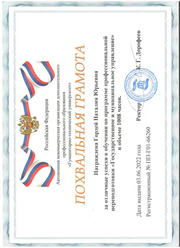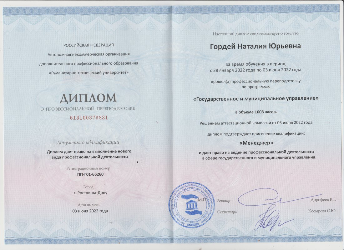 прошла профессиональную переподготовку в 2022 г. в Автономной некоммерческой организации дополнительного профессионального образования "Гуманитарно-технический университет" г. Ростов-на-Дону. по программе: "Государственное и муниципальное управление" в объёме 1008 часов и присвоена квалификация: "Менеджер";