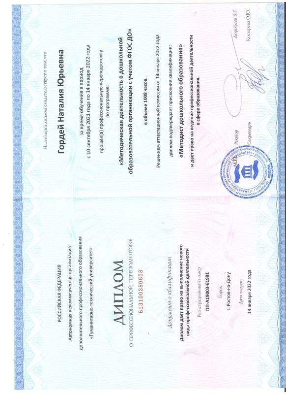 прошла профессиональную переподготовку в 2022 г. в Автономной некоммерческой организации дополнительного профессионального образования "Гуманитарно-технический университет" г. Ростов-на-Дону. по программе: "Методическая деятельность в дошкольной образовательной организации с учётом ФГОС ДО" в объёме 1008 часов и присвоена квалификация: "Методист дошкольного образования";