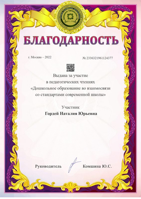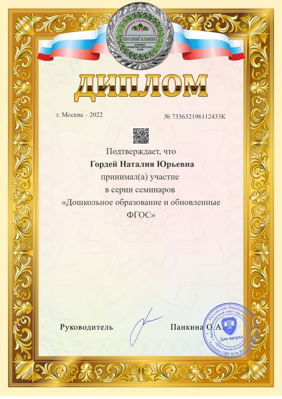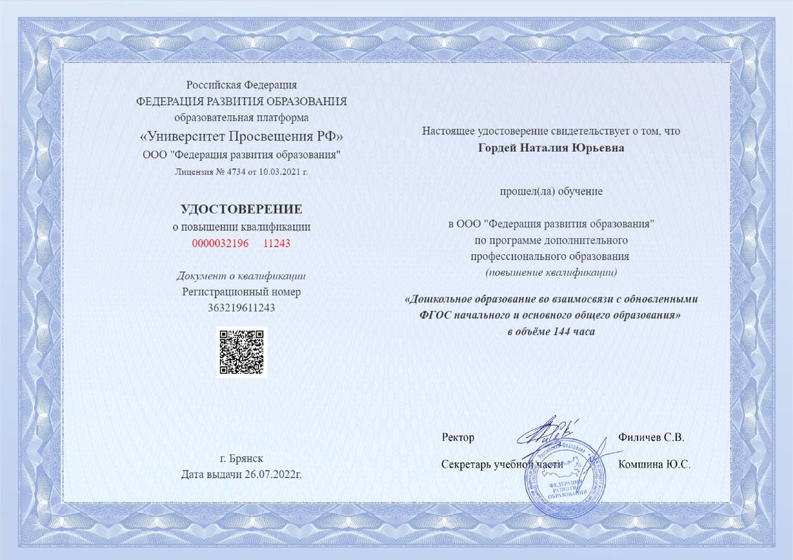 в июле 2022 г. прошла обучение в ООО "Федерация развития образования" г. Брянск по программе: "Дошкольное образование во взаимосвязи с обновлёнными ФГОС начального и основного общего образования" в объёме 144 часа.